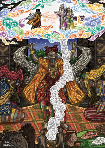 Illustration made for use on my blog, Portal dos Mitos. Joyboy is the name of a character from Caribbean folklore, said to be the spirit that personifies the human need to dance, sing and rejoice. It is said that he perpetually smiles at all of humanity's weaknesses and problems, and heals human problems through an irresistible rhythm played by his drum. Anyone who hears the music played by Joyboy is automatically forced to dance and sing along, until he shakes the "black cloak of despair" from his shoulders. Some jazz musicians have claimed to have captured Joyboy's rhythms, but their attempts to reproduce its magical effects never came close.