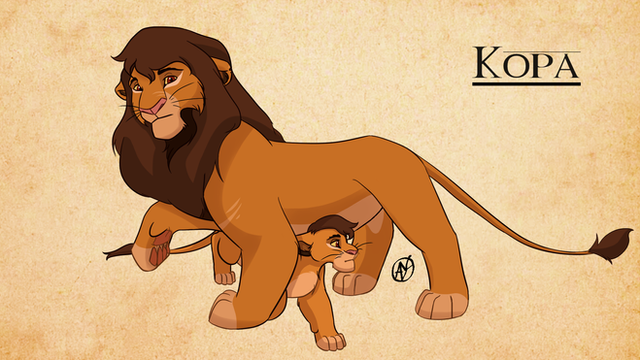 I seldom see a version of Kopa that I find interesting. Typically, he's a teen/young adult trying to forge his own path, a tough rogue who returns to the Pridelands covered in battle scars, a big fluffy friendly guy that everyone loves, etc. and usually, more often than not, was in some disastrous event as a kid that separated him from everyone else, usually Zira, sometimes something else.