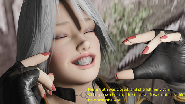 Felicia chews the tiny woman's body, savouring every bite.Soon, only a tiny hand sticking out between her lips is the only trace of there ever existing a two inch intruder in her presence.