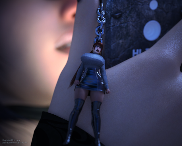 Felicia drops the minuscule woman down her cleavage. As she does this, the tiny scamp tries to claw her way out."Oh no, you're not going anywhere."