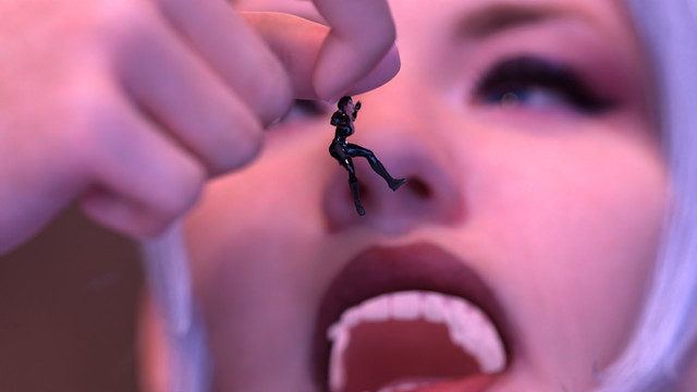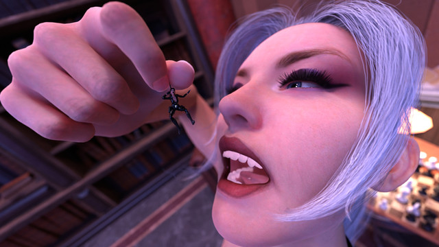 As she drops the tiny woman down towards her mouth, Felicia feels a dull impact on her tongue, then a squirming on her lips.She closes her eyes as she savors the aromas and the warmth of the body.