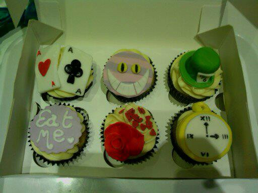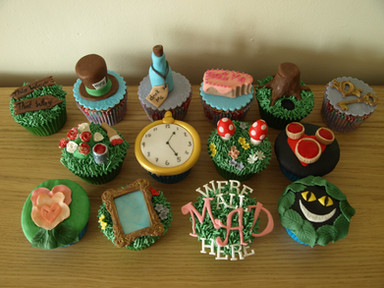 The complete set of Alice In Wonderland cupcakes!Clockwise from top: