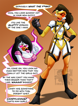 I love her outfit. Sooo hot! Also QJ's expression amuses me... it's like he's mesmerized by the boobies XD