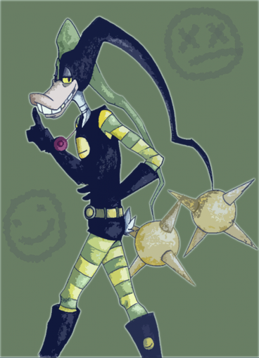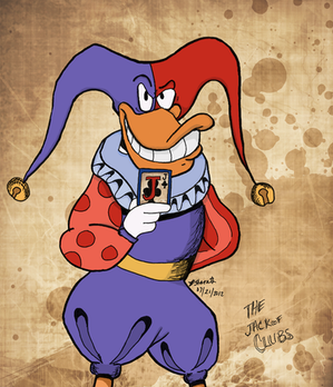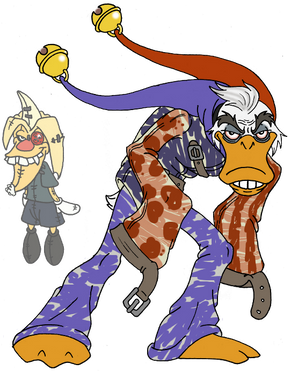 And here we have Quackerjack, except my version of him has got kind of a weird clown/ninja thing going for him. Still crazy, still a bit of a kidult, but he also has stealth and fighting skills! I know, I'm retarded.Quackerjack (c) Disney, all rights reserved