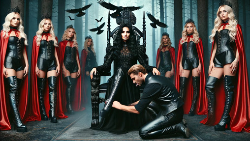 Maleficent with the help of Princess Aurora's betrayal of the prince, has ruined prince charming to the point of a helpless slave. His complete surrender and slavish demeanor pleases Maleficent. She rather enjoys treating him in a careless manner. He has become a mere object to her. Something to rest her boots on. She commands him to "Lick one of her boot soles clean, while placing the other boot heel firmly in his chest pushing until he groans. Music to her ears, his suffering under her boots. She wishes the Princess could witness her cruel treatment of him. Perhaps she will invite her to join in humiliating him!