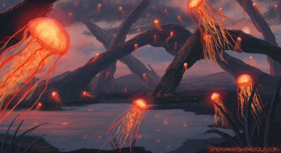Several things are being showcased in this illustration. First off, the celestial bodies. Several suns (The Ember and Sol) and a silver moon can be seen, as well as that big monstrosity in the sky. Here’s what Martin told me about it: