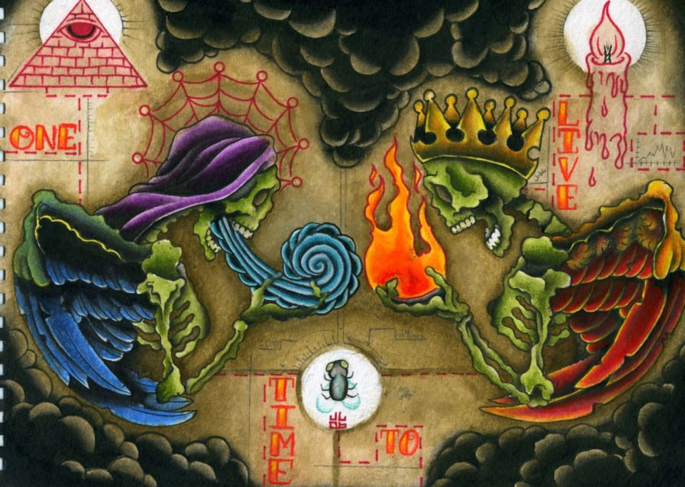 So freakin awesome, the concept rocks. Are the skeletons coloured in pencil? If so, do you lay down the black shading first then colour over it or the other way around?