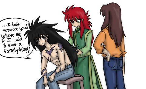 Kurama: I'm sorry, Hiei, but I need to help Yusuke find a group of psychics trying to destroy the world. Forgive me if the trees don't warrant my immediate attention.
