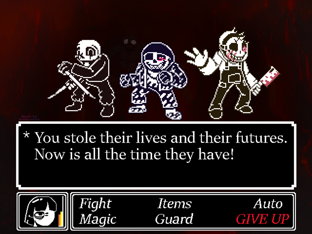 In this au Papyrus is considered a god, everyone in underground worships papyrus day and night and it causes a massive sleep deprivation,everyone thinks papyrus will shatter the barrier and free everyone, the problem is, papyrus is asleep for ages, and no one knows how to wake him, monsters are doing rituals using humans who were unfortunate enough to fall into the underground. Sans is the leader of this massive cult, Sans can't use gaster blasters due to him not having enough power instead he uses bones and mostly his knife which he uses in every ritual, There's rumors that sans knows how to wake papyrus but his mouth got shut by some mysterious powers, for only his knowledge he doesn't want to wake papyrus yet.