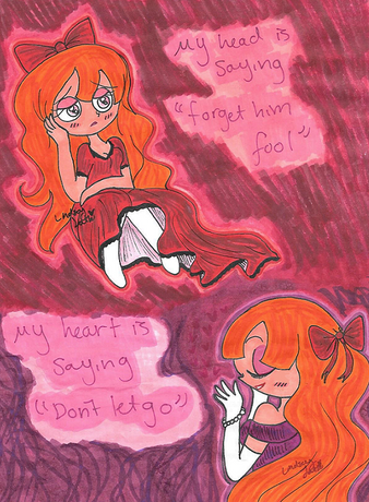 Wow. All I can say is... wow. It's very rare to see a picture that delves into the more human aspects of the PPG villains' souls like this. The simple color scheme and scribbled images and text show her confusion.