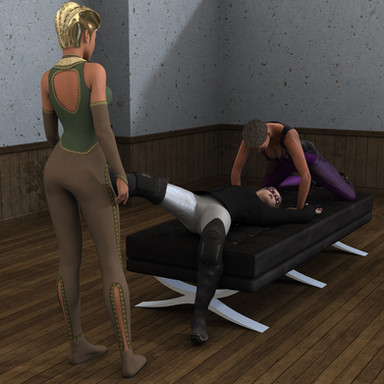 Green Shirt and Wife Beater snatched Margot's wrists and ankles, pinning the squirming sidekick to the couch.