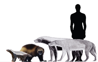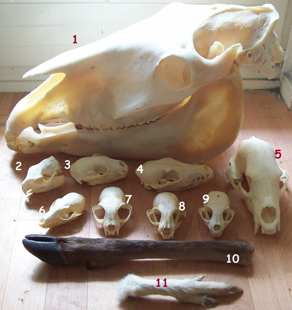 second shelf on the left - gulo gulo, mellivora capensis, procyon lotor, lontra canadensis, martes martes, mephis mephis, novison vison,