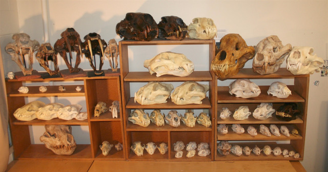 top shelf, left to right - Smilodon fatalis, megantereon inexpectatus, smilodon populator, xenosmilus hodsonae, aphimachairodus giganteus, panthera atrox, panthera leo spelaea, panthera leo and lynx canadensis skeletonthird shelf on the left - canis lupus, lycaon pictus, canis latrans, canis mesomelas, vulpes vulpes, urocyon cinereoargenteus, hesperocyon gregarius.