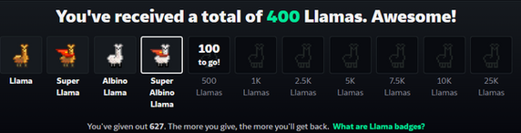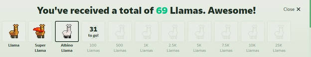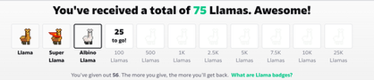I caught myself as I crossed the threshold of gold(en llama)The next step is a way off... 25000 llamas. After that is the ultimate nirvana, Maximum Llama (100,000). Last I checked, once you get 100,000 llamas you can't get any more.