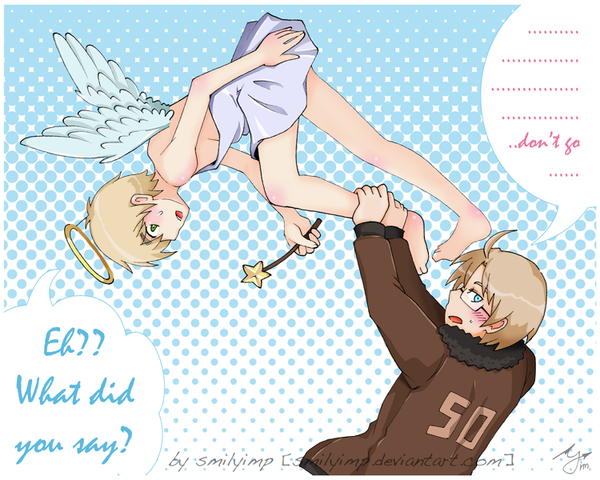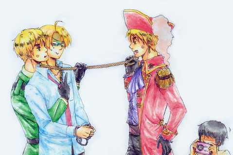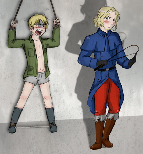 Β : Besides! You're already mine! Your vital regions are mine! Come on! ( Begins dragging England away to a bedroom)