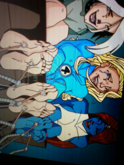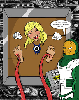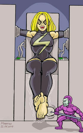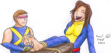 Specifics: Subject in solid metal restraints, rendering invisibility powers irrelevent. Soles of feet tickled by Serpentia, Queen Regent of Persai'i 3. Pheromones from Queen Regent trigger hypersensitivity in humans.