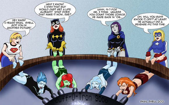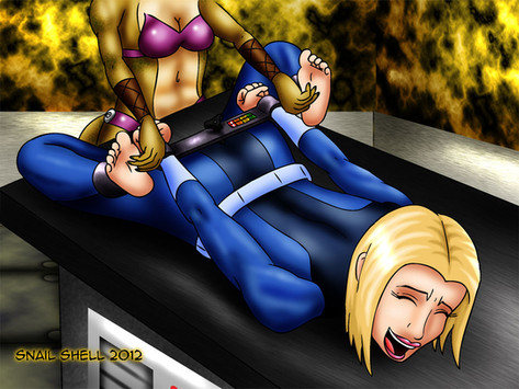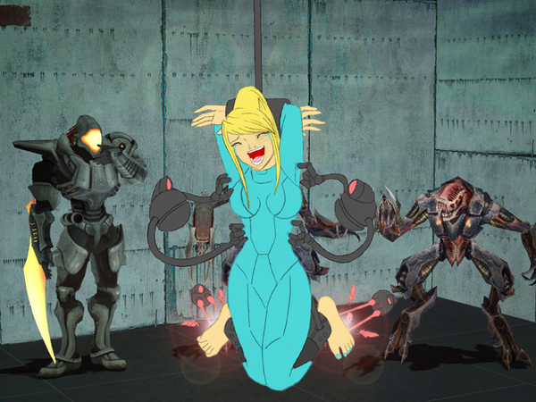 The eternal trade-off: Do I put all that time and effort into the painstaking detail of colouring the line art for that cool glowy effect or do I give up, call it a piece and submit for the approval of all? *sigh*Samus Aran of being tickled by Metroid-fueled tickling devices while her mysterious tormentors look on.