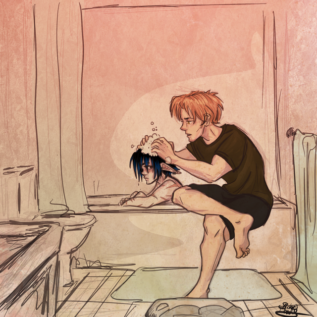 Adam is sick and needs comfortWhat I love about this piece is not only the cozy vibe that reflects the close brotherly bond these two have, but the fact that I allowed myself to work loosely without proper inking or worrying about coloring in the lines. Needless to say it was really relaxing and freeing!
