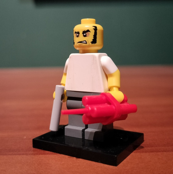 I first cam up with this idea a long time ago when I was a Jang Bricks review of an old mid 70's Lego set with an early mini figure in it. After seeing the old figure I got an idea for using the old torso for a straight jacket part was perfect for it. A little while ago while looking at parts on one brick link shop I found an old torso in white and had to add it to my order and made this guy.I have seen many dressings for Lego straight jackets, many use things like armless torsos, custom decals, and overly complicated and or illegal building designs. So far I have yet to see anyone use an old 70's torso to make a straight jacket figure so I guess this is a first.
