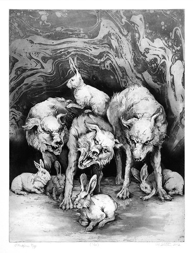Before I read your comment, I thought to myself, "This really reminds me of Watership Down!" The web-like texture of the large rabbit and the background are disturbing yet beautiful. I noticed that most of the rabbits have injured or pale eyes - the white blindness?