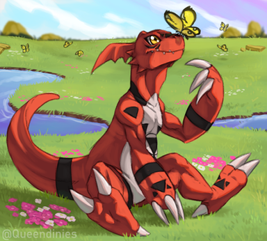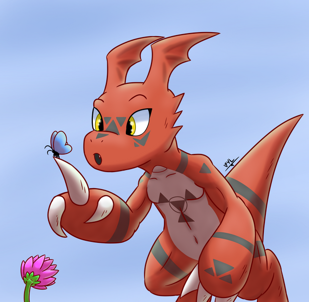 That may be one of the most impressive pics of guilmon IΒ΄ve seen... you really capture his innocence.. (helps that itΒ΄s a butterfly) Has a good relaxing feeling about it .