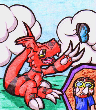 WEE!! Guilmon is one of my favorite digimon as well as Agumon, and I love the innocent curiosity on his face! too bad it isn't Navi the fairy instead of a butterfly, to mix anime with games o_O heehee good job