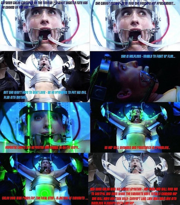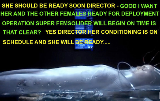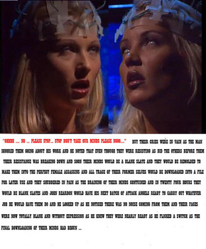 "NO....LET ME GO!!! cried out a woman as she struggled against the grip of two men dressed in fatiques - and at the same another woman was dragged kicking and screaming into a room. "LET ME GO.. WHAT IS THE MEANING OF THIS?" but no answer was forthcoming as a man wearing a white coat approached with a syringe and the men forced the women's arms outward.. "NO PLEASE " as he injected them and in seconds they ceased their protests and were guided to two disks set next to a giant computer. They were quickly undressed and placed on the disks then two men lowered helmets on their heads fastening it in places then hooking up cables to connectors on the helmets then after making adjustments to a small box walked away.A man at a console went to work as he typed in a set of commands then after getting a blinking green light from the box pressed a key and a humming filled the room as the cables began to glow as electronic impulses flowed thru the cables into the headset- a beeping sound was heard as a screen flickered to life with the words UPLINK COMPLETE.... PRESS YES TO PROCEED?...... the man pressed the key and the humming grew louder as the women began to shudder and moan then stiffened at attention then their eyes which were closed opened and they were a compound white...