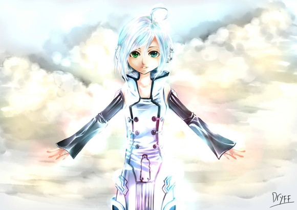 The hard work definately paid off in the end. The bg makes it have a very serene look, with the pure white, and her expression fits the piece eerily well. I don't think you made her skin too dark, either :3 it's a nice contrast to all the white~ Love the blue streaks in the hair btw!