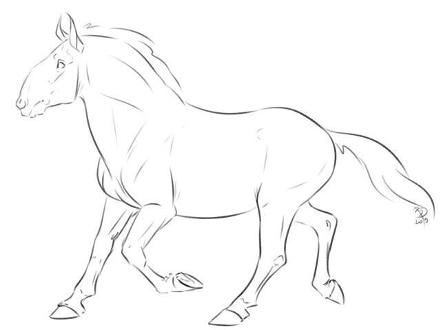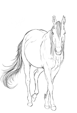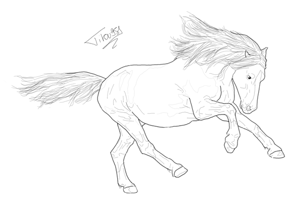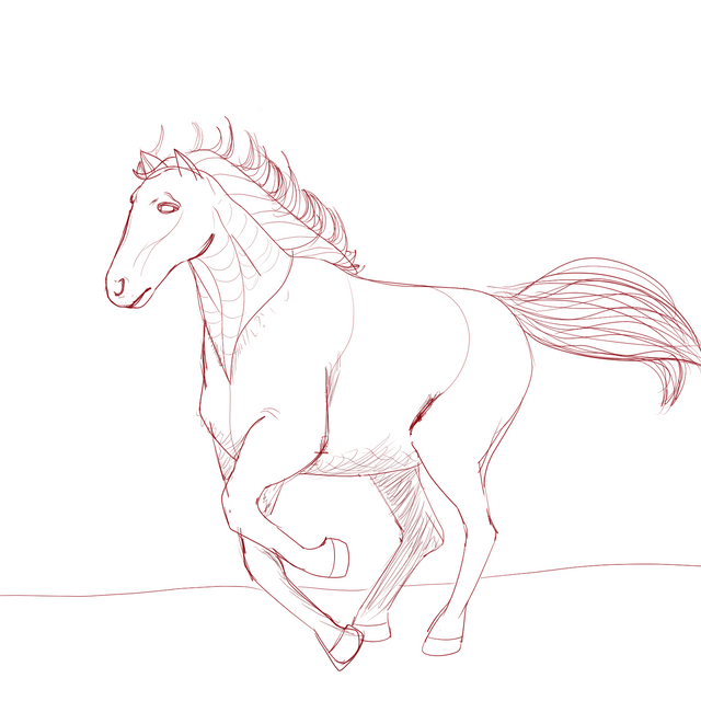 The movement in the picture is lovely as is the shape for the mane and tail. However i would recommend either darker or lighter base colour for the mane and tail as the look slightly out of place. Try colour picking from the original mane or the body and working from there as this should help it blend better. Otherwise lovely, especially for a first attempt ^_^