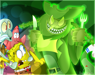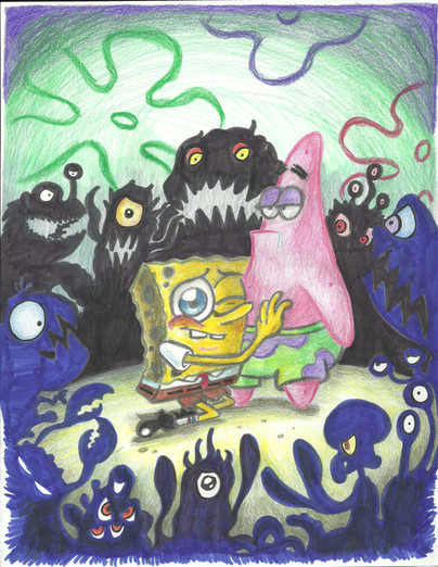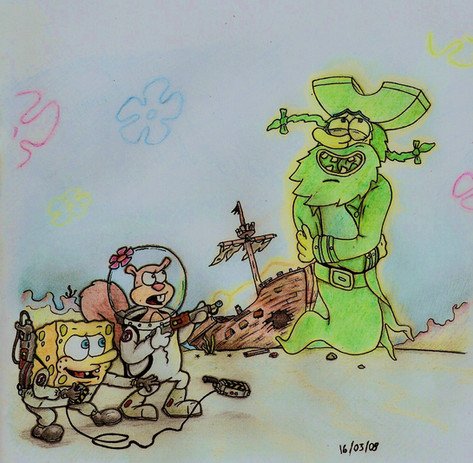 Anyways, Hello Kitty and her friends insist that Spongebob and Patrick explore with them. So Spongebob bets Patrick that he will not be scared one bit on this ride, and shakes Patricks hand. Patrick gets grumpy remembering the last handshake he received and he just stares at his hand as they enter. So they enter the ride, and climb into one of the old carts to see what was in it, However, they get strapped into the cart and the ride starts automatically for unknown reasons, and they're soon hurtling through the haunted rollar coaster ride, greeted by creepy glowing zombie like hands.... and ghostly creepy Patchy the Pirate because.... why not? IT"S TIME TO WALK THE PLANK KIDDIES!!!!! ( I like Patchy XD) Perhaps it's the ghost of Patchy wanted revenge on Spongebob for betraying him or something XD I'll leave it up to you XD The only thing that bugs my is the rollar coaster track in the upper right corner, that could have been better but I wanted to demonstrate that they are indeed on a rollarcoaster! Let the screaming frightful ride begin!!