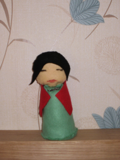 La muñeca está hecha con lana, fieltro y bolitas pintadas como ojos.