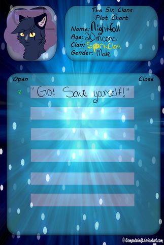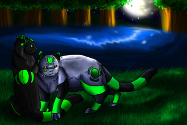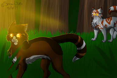 This is my contest entry for RiverSpirit456 :3 I honestly have no idea what the hell is going on here, it's kind of just a made up scene, I guess. And River, sorry, I kind of made Forerunner look...StarClanny..xD If that makes sense. I was kinda just having fun with the effects and stuff, cuz I've never drawn a transparent character before, lmao. xDRiver is kind of just...standing there, crying. o_o Maybe reflecting on past events from when she was a kit when she's an adult? xD And then there's Forerunner, just like...floating by her in comfort or something. xD