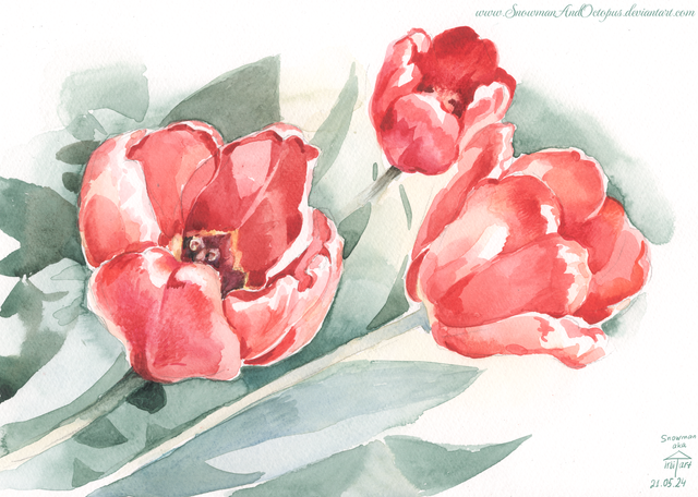 We really wanted to meet this May - Snowman and Octopus .. and draw together. But it didn't work out. Therefore, we made this project - drawing a bouquet together online. Since Octopus was presented with bouquets for her birthday, the idea appeared by itself. Octopus set up the camera and broadcast his bouquet to Snowman. At the same time, each of us painted this bouquet with watercolors while in different cities. This is a watercolor made by Snowman. And the watercolor of Octopus will be later, because she constantly ran away to drink coffee and eat cakes - she has not had time to finish painting yet.