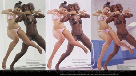 The bottom row shows three identical renders except for changes to the characters' skin tones and some of my own thoughts about why having character variety is important.