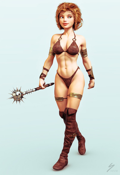3rd "rough" of Lust, probably pretty close to what his general look will be. Based largely on my rough painted test "Gorgon Hunter" and new wildly-cloned curly hair based on poll results. Now he looks sorta like he has an afro too, lol (that wasn't my intention, I just tried to clone away the artificial-looking 3D curls). Will try to make them a little less dense next time.He should do whenever we need a male hero (which isn't very often according to you guys, haha).