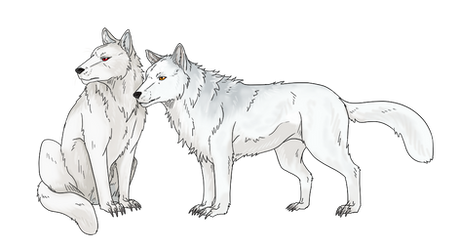 Snowy and a new character, Tlak. Both being white wolves (Tlak's markings are minimal), I wanted to make sure that they could be distinguished physically, since I couldn't very well rely on markings alone to differentiate them. The fact that one's female and the other's male helped immensely, of course.Coincidentally, these two could never actually meet like this -- Tlak comes from a later storyline than Snowy.