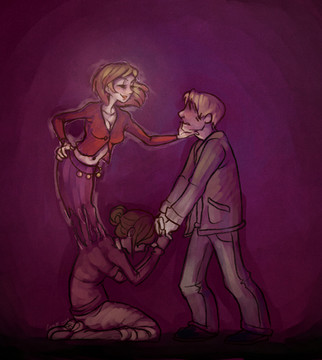 *guild him under cloth covered table*