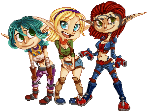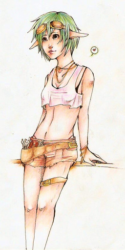 My Jak and Daxter OC, Aeris (I didn't know anything about Aeris/Aerith from FF when I made her, so no, it's not because of that). She's been with me for years, her look never changing too much. She's a bit out of place here, I just did her around christmas, so she was influenced a bit by that. She's not really that tall or thin or whatever, she's quite small (about 160 cm) and she's never really that content.Well, basically, she grew up in the slums, got kicked out of her home for being a supposed "threat" to her parents (she dreamt of becoming a Krimzon Guard for some reason, she didn't really think they were doing wrong), ended up in an asylum (Don't think Haven's got one, so made up I guess), met her soon-to-be best friend Neyla, escaped a few years later, wandered the streets for a long while, stole some fruit from the Bazaar and got busted by Erol who was seemingly randomly out to snatch up street urchins (laaame). She then spent a few nights in jail, escaped but almost died in the process, was saved by Erol, was then out of the blue asked to be his assistant when he found out about her dream, said yes, and voila: You've got yourself a moody, saracastic and tough little girl working for the craziest man ever to set foot in Haven City. And quite frankly, she's okay with it.