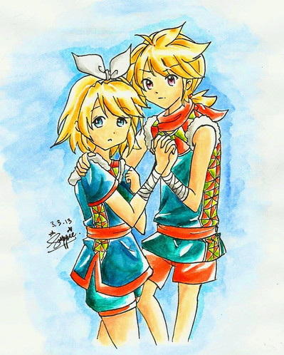so Rin & Len Kagamine are two singers who have the same surname, so it's quite logical to say they're twins(plus they look alike ^^ )