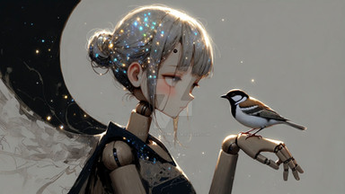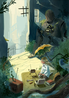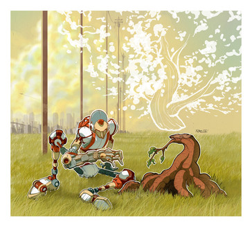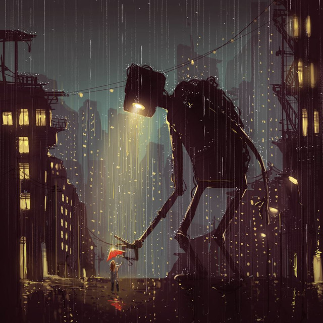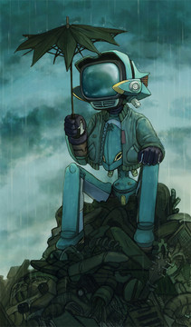 Tiny robot that lives in the scrapyard hills on the edge of the citygets shielded from the rain by a bypassing Mecha ΓΆ w ΓΆ