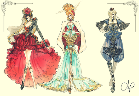 I just remembered I had this sitting around in my computer. did it a while ago, got so busy never finished it. I was inspired by a book that I have with european fashions from the 1800s. I tried to put a more modern spin on the same looks as well as mixed it with some asian fabrics*edit* holy snappolas thats all I can say. my eyes are doing this right now O_O.