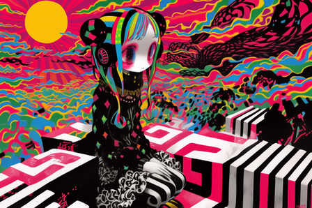 there is quite a bit of time spent on this. all the characters are done in illustrator totaling more hours the i wish to remember. all done with the pen tool. no fancy tricks just outlining and re-outlining. the main visual in this poster is a chacater by Aya kato which i have completely re-vectored and givien a completely different setting and color.everyline of black done in illustrator