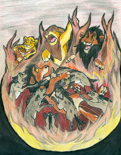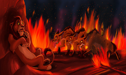 Shenzi led the way for the other two, safely guiding them through the flames. Then she came to a sharp stop as her eyes fell on the violence. She assumed it would have been all over at this point, but her smirk faded as two piercing green eyes locked onto her own. Hyenas swarmed over the lion and it seemed as if he'd given up the fight. The bloodshed was immense and the clan was in a frenzy, trying to get at as much as they could before the flames became too unbearable.
