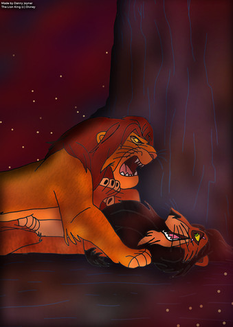 Yeah, I always assumed the hyenas got away myself (especially since in Simba's Pride Nuka (I think it was Nuka - haven't watched SP in years) mentions how the hyenas "ran off") I may write an alternative to this where Scar escapes, cause I just about cried while I wrote this one (and while I drew the picture too), pathetic as that is XD I think this scene was the most violent and tragic in the movie, even worse than the stampede. For Mufasa, at least, it would have been all over quick...a fall that high, I feel we would have went out like a light when he hit the ground. Scar was well...eaten, by the only creatures he might have ever considered friends. That would have been slow and agonizing in more ways than one. Not even the baddest of villains deserves that, violent Disney...violent. D;