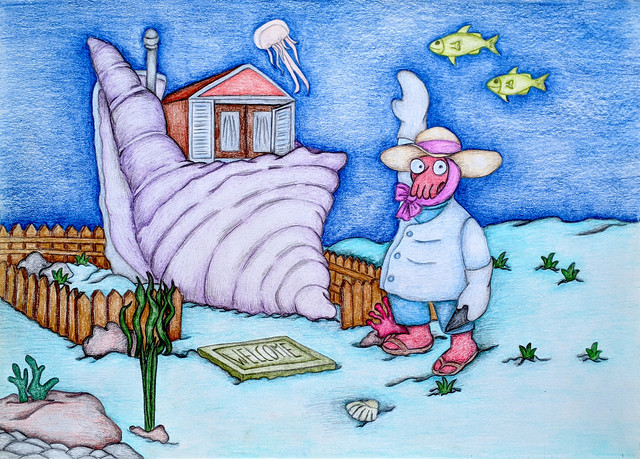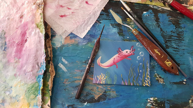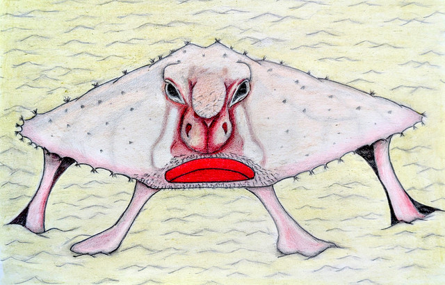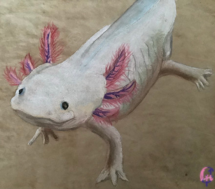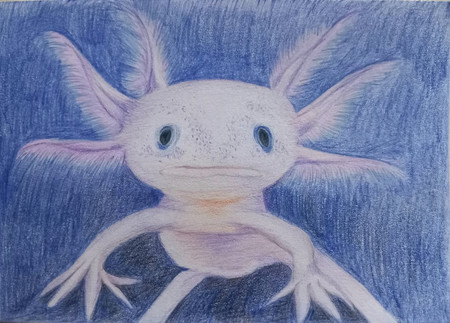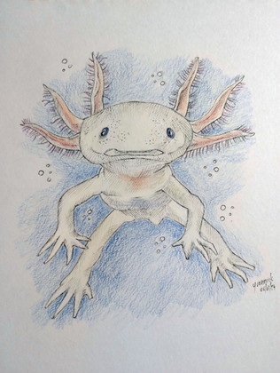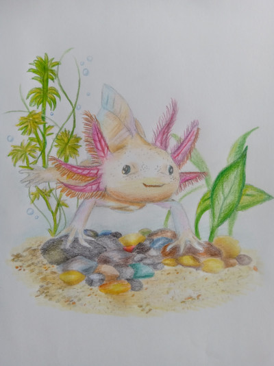 This is a drawing of an axolotl. The axolotl is a salamander type of amphibian. They're unusual amongst amphibians, in that they retain their immature state when in adulthood. In this state, they retain their gills rather than grow lungs like other salamanders, so are restricted to living in water rather than on land. They also have the ability to regenerate lost limbs, as well as regenerate its spine, heart and other organs. They're carnivorous, hunting at night for crustaceans, molluscs, small fish, insect larva and worms, where they use suction to capture their prey. Their lifespan is up to ten years in the wild and up to fifteen in captivity.Related content