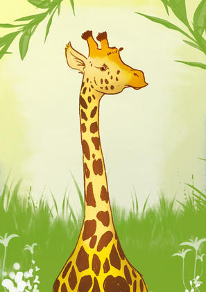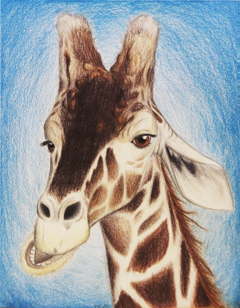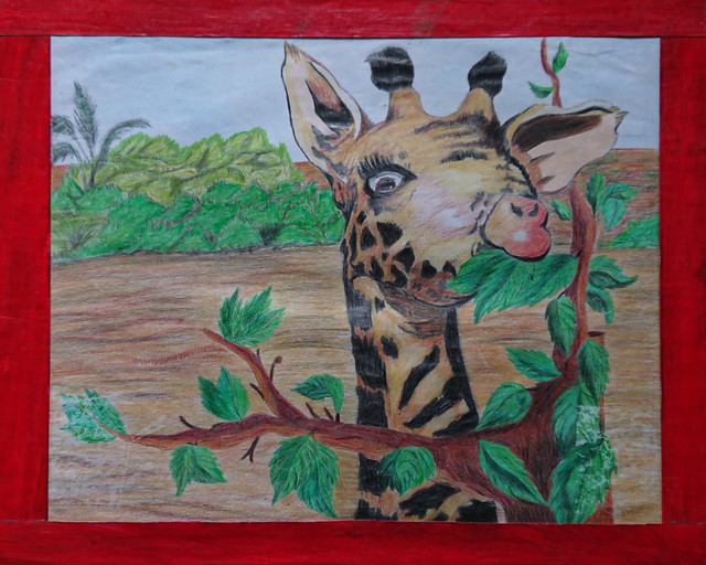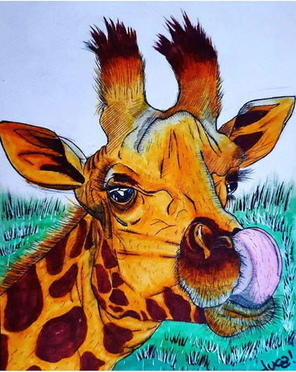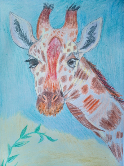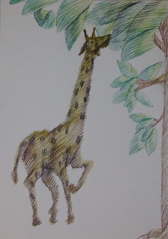 This is a drawing I've done of a giraffe. The giraffe is a distinctive herbivorous mammal from Africa that has a very long neck, which helps it eat food from high up trees that other ground dwelling species would find impossible to get to. They're the largest of the ruminants. The giraffe I've drawn is using its height to munch at some leaves.Related content
