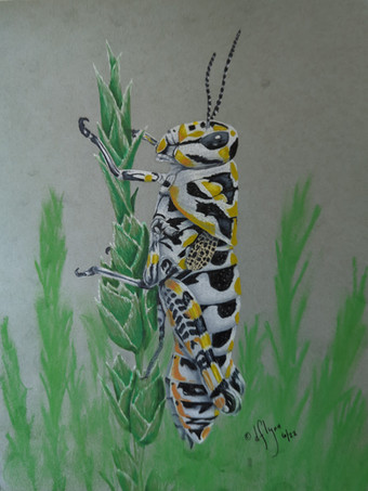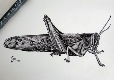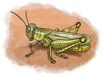 This is a drawing of a locust. They're worldwide, but mostly in Africa and Asia, where they cause a lot of devastation to crops and harvests. They create swarms of billions, which move from area to area consuming all crop vegetation in their path, which in turn can cause devastating famines in regions affected by them.Locusts are closely related to grasshoppers, being members of the acrididae family that have a swarming phase.