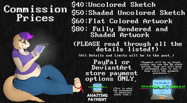 Heya! Things have been sucky for me, health-wise, enough so that I'm not really able to work, be it brick-and-mortar or doing an at-home call center thing. Until I can find a resolution for this, I need to be able to pay for the internet, my car, groceries and other necessities; so I'd like to take some commissions!This is my most recent price sheet, though I'm open to negotiation on price. I tried to include mostly SFW stuff so I don't anger the algorithm too much!