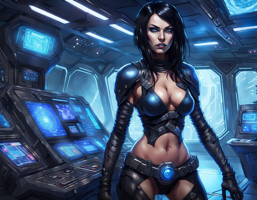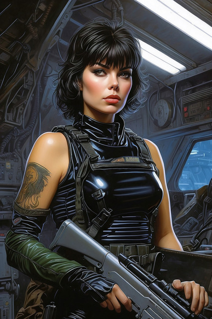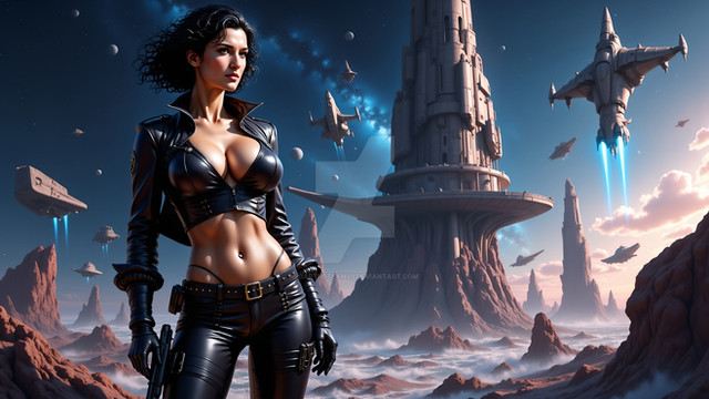 #scifi #digitalart #wallpaper #space #spaceship #portrait #beauty #cyberpunk #brunette #choker #gun #lace #laserpistol #sidearm #stockings #sexybeautiful #brunettebeauty #gorgeousbeauty