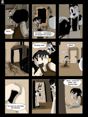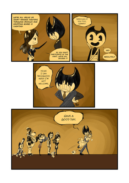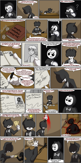 I love that you took an old-timey cartoon style for the comic, and I'm so ready to get a proper intro for our villain in the next page! She looks super cool, and I love me some girl villains! That, and I hope that money Bendy owes doesn't come back to bite him later... I have a feeling it won't be good. I don't have that much to say since it's kind of the beginning of the comic, but I'm super excited to see what's next, and I wish you luck with drawing the next page of the comic!